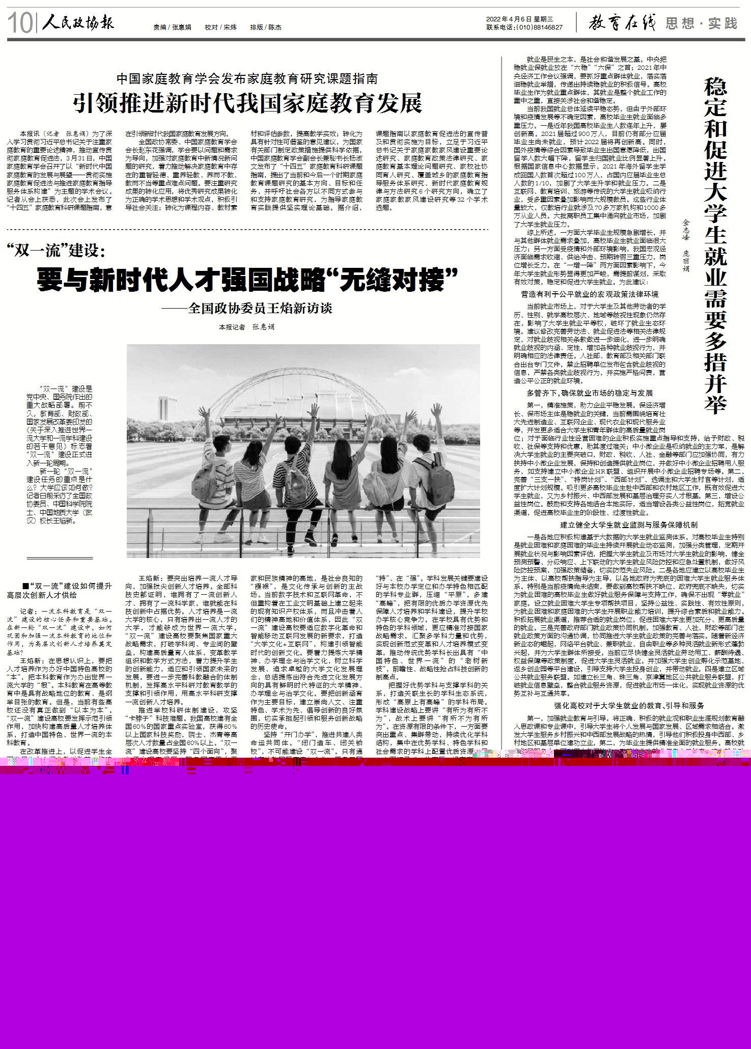 王焰新:要突出培養一流人才導向,加強拔尖創新人才培養。全部科技史都證明,誰擁有了一流創新人才、擁有了一流科學家,誰就能在科技創新中占據優勢。人才培養是一流大學的核心,只有培養出一流人才的大學,才能夠成為世界一流大學。“雙一流”建設高校要聚焦國家重大戰略需求,打破學科間、專業間的壁壘,構建高質量育人體系,變革教學組織和教學方式方法,著力提升學生的創新能力,適應和引領國家未來的發展。要進一步完善科教融合的體制機制,發揮高水平科研對教育教學的支撐和引領作用,用高水平科研支撐一流創新人才培養。